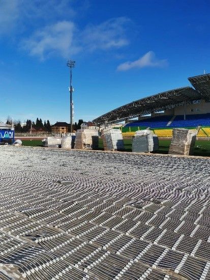 The pipe system can be filled with sand and granite chips or covered with artificial turf. It is also possible to apply a hard quartz polymer coating to the pipe system. In winter, the area can be used as an ice skating rink, while in summer it can be used as a soccer, basketball, volleyball, tennis court, or simply as a rigid public area (in the case of a quartz polymer coating).