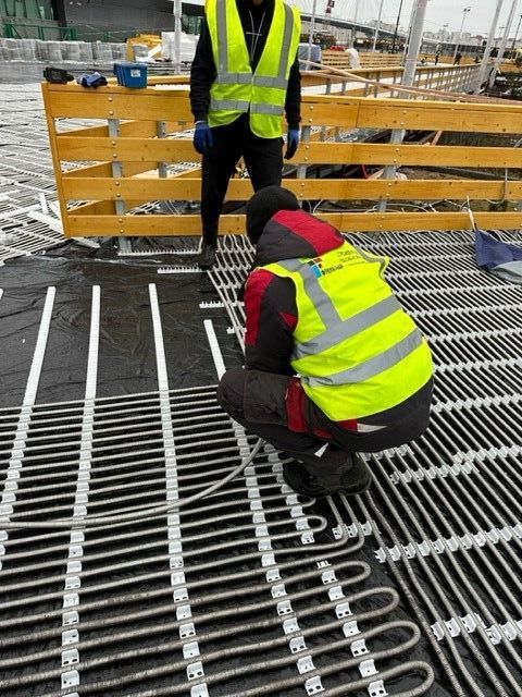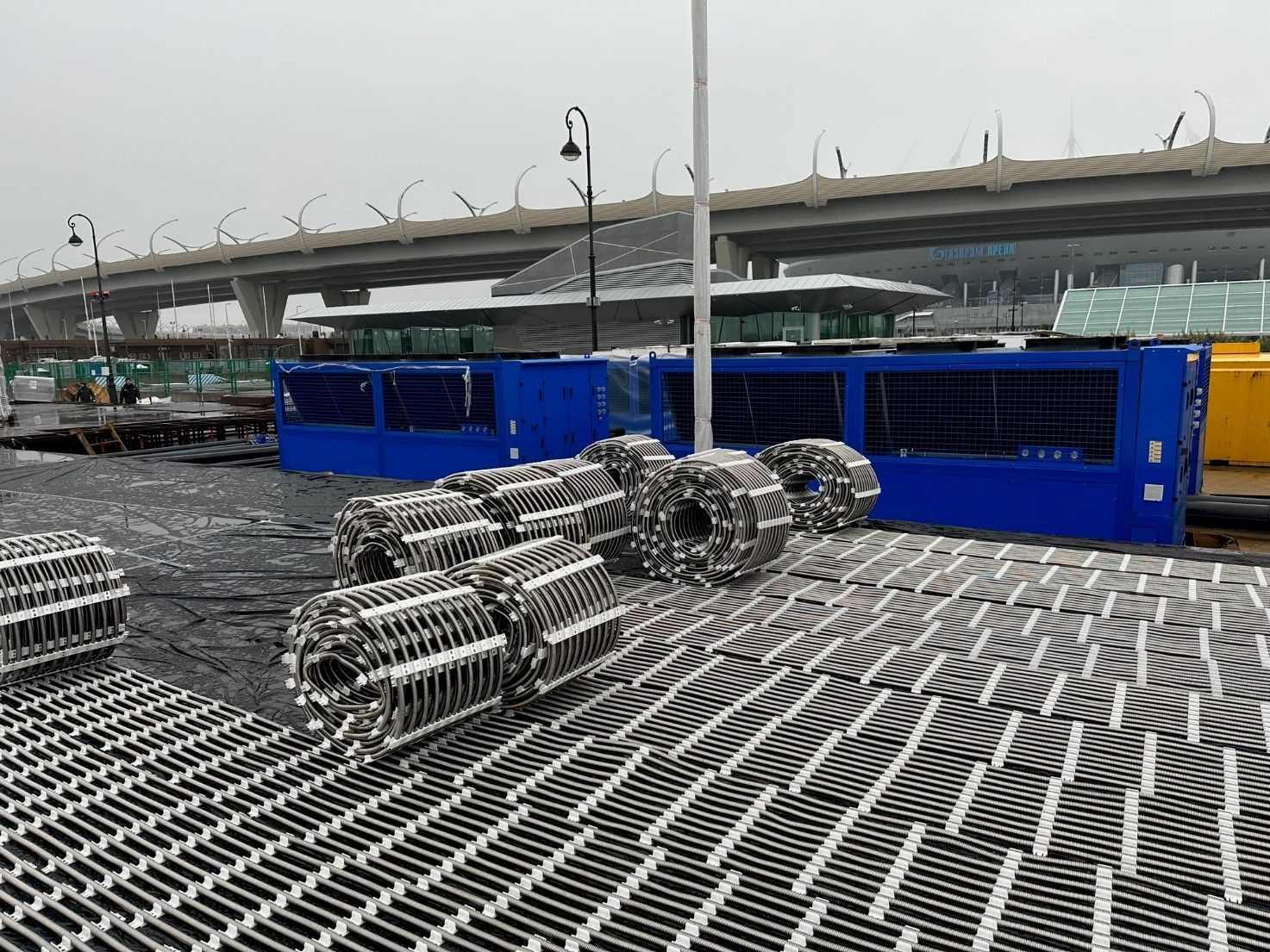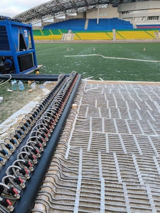 The HDPE collector system is installed primarily along the short side of the ice rink and connected to a cooling unit with a hydraulic module. A water shut-off valve is installed on each pipe, allowing you to immediately shut off the circuit in an emergency.